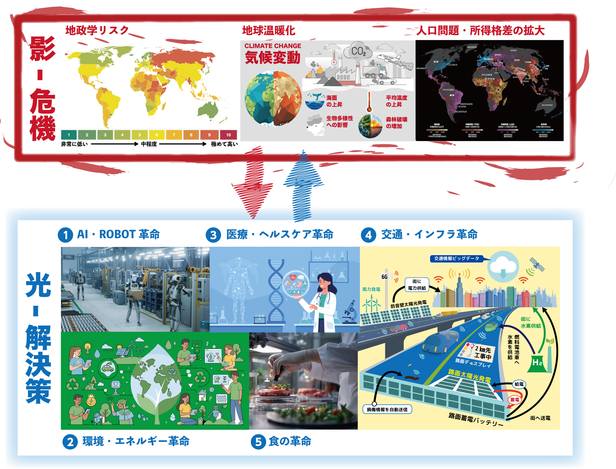 連日凄まじいほど連呼される“AI”や“Robot”をはじめ、未来の技術群やサービスには、 ”光ある明るい未来“を照らす一方、必ず”暗い影“が表裏一体で潜んでいる。そう、AIは膨大な電力消費量と騒音などの危険性が潜み、本当にそんなに需要があるのか?という疑問も生じる。しかしながら、そうした生まれてくる課題に対して、新たなソリューションやビジネスチャンスが生まれてくるのも必然の流れ。今号は今ある危機とそれらを解決するテクノロジーやビジネスモデルの大予測をまとめてみました。